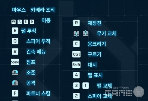 게임 조작은 자연스럽게 익혀지겠지만 한번 열어서 어떤 키가 있을지 살펴보면 좋다. 스페이스=점프와 같은 생리적으로 익숙한 키도 있지만 E=스피어 투척, F=파트너 스킬, Ctrl=구르기, 4=팰 표시, 3,1=팰 교체, 2=스피어 교체와 같이 이 게임에서만 사용되는 키도 있다.