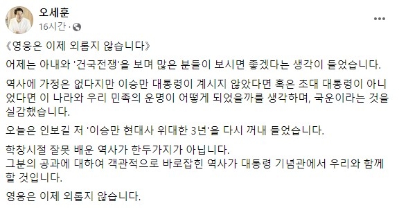 오 시장은 11일 오후 페이스북에 올린 글에서 "어제(10일) 아내와 '건국전쟁'을 보며 많은 분들이 보시면 좋겠다는 생각이 들었다"며 "이승만 (전) 대통령이 계시지 않았다면 혹은 (그가) 초대 대통령이 아니었다면 이 나라와 우리 민족의 운명이 어떻게 되었을까를 생각하며 국운이라는 것을 실감했다"고 했다.