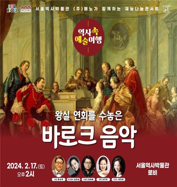 ▲ 서울역사박물관은 '왕실 연회를 수놓은 바로크 음악'을 주제로 17일 오후 2시 종로구박물관 로비에서 무료 공연을 연다고 13일 밝혔다. '역사 속 예술여행'이라는 테마로 개최하는 2024년 재능나눔콘서트의 첫 공연이며 2, 4, 7, 8월, 11월 셋째 주 토요일 총 5회 개최 예정이다. (서울=연합뉴스)(끝)<저작권자(c) 연합뉴스, 무단 전재-재배포, AI 학습 및 활용 금지>