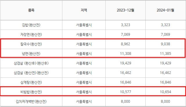 냉면 가격은 작년 12월 1만1천308원에서 올해 1월 1만1천385원으로, 비빔밥 가격은 같은 기간 1만577원에서 1만654원으로 각각 소폭 올랐다.