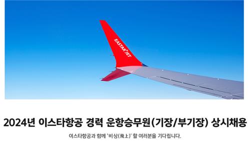 (서울=연합뉴스) 임성호 기자 = 이스타항공은 경력 운항 승무원(기장·부기장) 상시 채용을 진행한다고 13일 밝혔다.