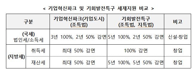 기업혁신파크는 법인세·소득세를 3년간 100%, 2년간 50% 감면해주지만, 기회발전특구는 5년간 100%, 2년간 50% 감면으로 세제 혜택이 더 크다. 또 취득세 100% 감면과 재산세 5년간 100%, 5년간 50% 감면 혜택도 주어진다.