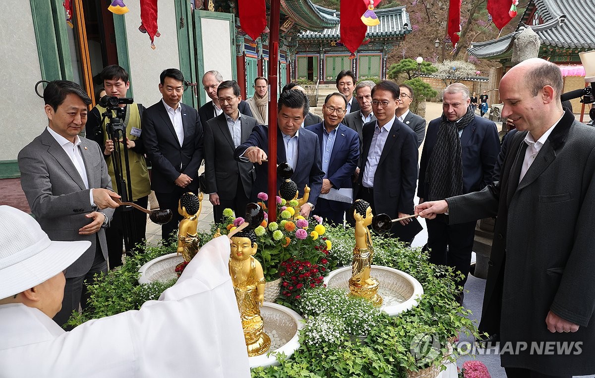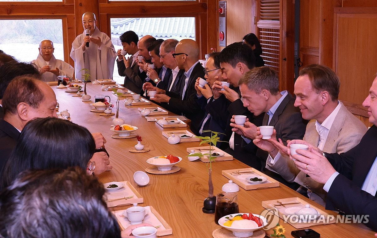 (서울=연합뉴스) 이슬기 기자 = 3일 서울 은평구 소재 사찰 진관사에서 반도체, 배터리 등 첨단산업 분야의 외국인 투자기업 대표들과 미국, 유럽, 일본, 중국 등의 주한외국상의 회장들이 모였다.