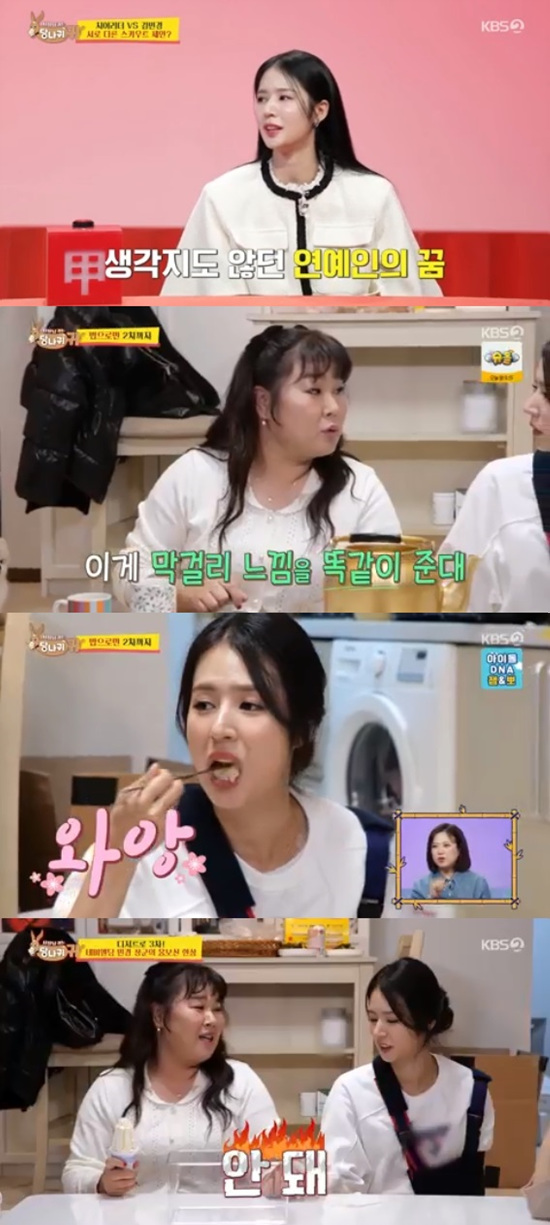 김민경은 박기량이 "칼로리가 너무 높다"며 놀라자 "먹으면서 칼로리 얘기하지 마라"라고 한소리 했다.