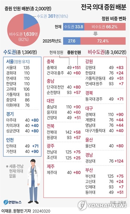 특히 비수도권 거점 국립대 의대의 정원은 200명으로 일제히 늘어나지만, 교육 여건을 제대로 고려하지 못했다는 지적이 제기됐다.