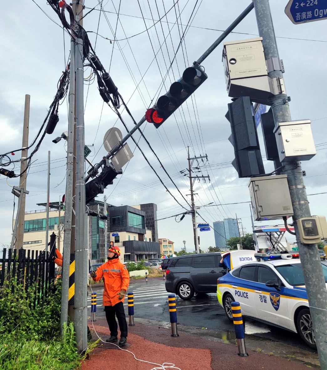 오후 2시 16분께 서귀포시 안덕면 덕수리에서는 나무가 쓰러졌고, 오후 3시께 제주시 노형동에서는 신호등이 꺾여 소방대원들이 출동해 안전조치했다.