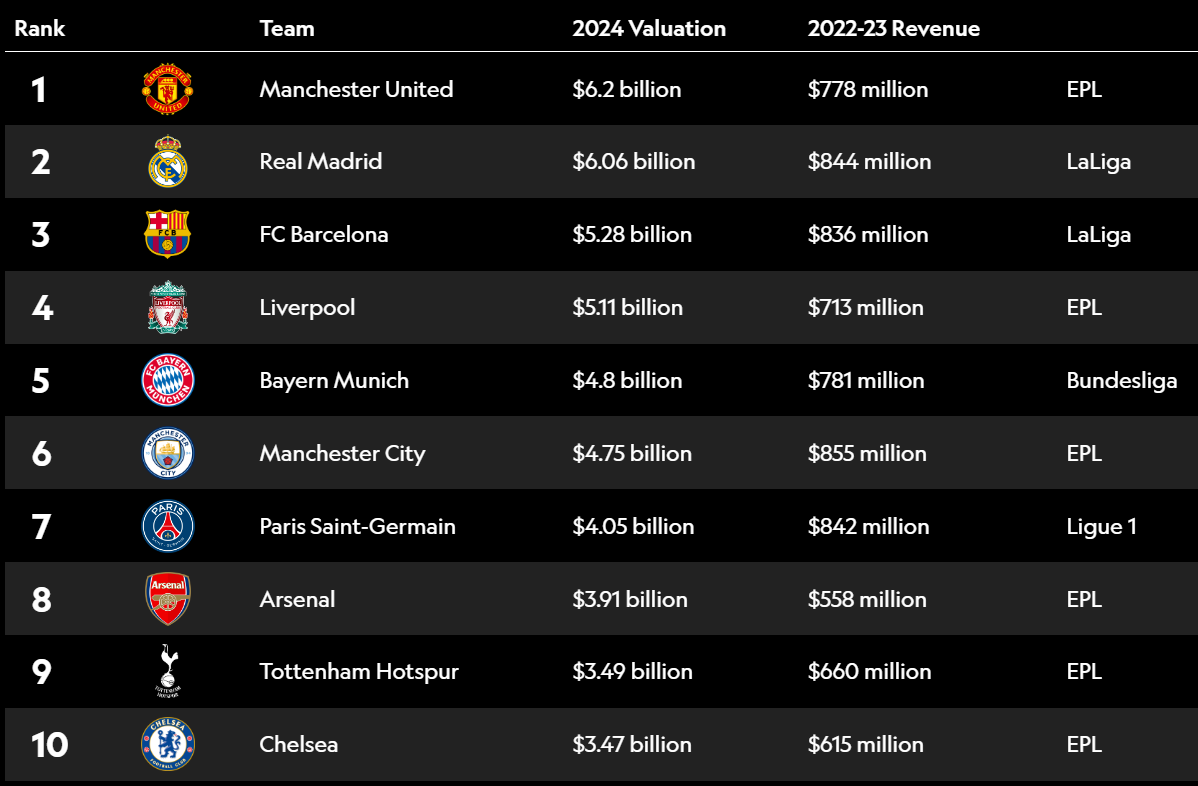 스포츠 산업 매체 '스포티코'는 9일(한국시간) 2024년 세계에서 가장 가치 있는 축구 구단 50개를 선정했다. 매체는 "상위 50개 구단 가치 총합은 796억 달러(약 109조 1700억원)다. 1위 맨유의 가치는 62억 달러(약 8조 5000억원)이다"고 전했다.