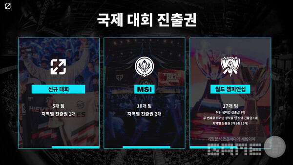 내용을 살펴보면 세 번의 스플릿과 세 번의 국제전 전체 도입이 핵심이다. 2025년 부터는 3스플릿과 3국제전 체제로 진행이 되는데, 순서를 따져보면 스플릿 1 이후 신규 국제전, 스플릿 2, MSI, 스플릿 3, 지역별 챔피언십, 월드 챔피언십 순이다.