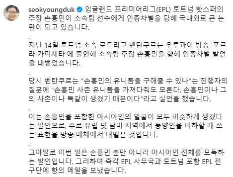 또 "그야말로 이번 일은 손흥민 뿐만 아니라 아시아인 전체를 모독하는 발언이다. 그리하여 즉각 EPL 사무국과 토트넘 포함 EPL 전 구단에 항의 메일을 보냈다"라며 "이번 메일에서는 '토트넘 구단은 벤탄쿠르에 강력한 처벌을 내려야만 하며, 이를 계기로 EPL 모든 구단에서 다시는 인종차별이 재발하지 않도록 주의를 기울어야 할 것'이라고 강조했다"고 밝혔다.