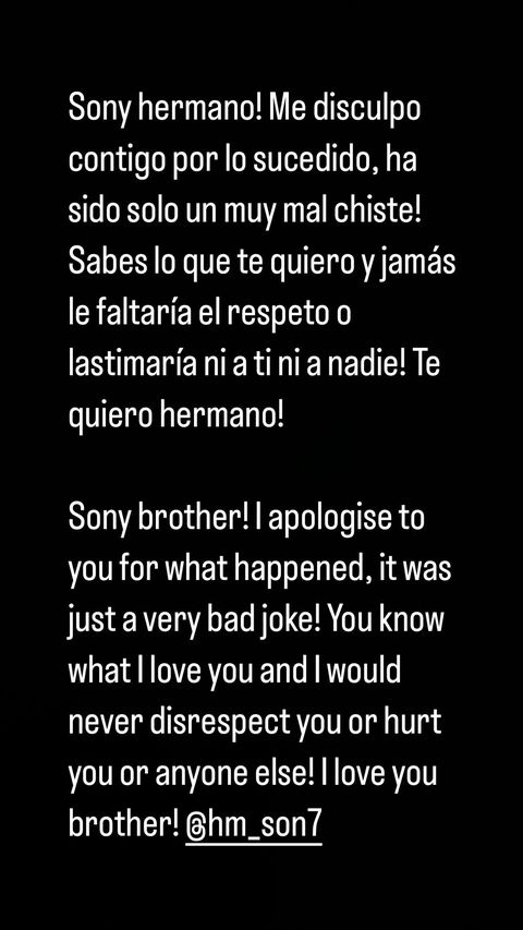 논란이 커지자 벤탄쿠르는 곧바로 사과문을 작성했다. 벤탄쿠르는 자신의 SNS 스토리 기능을 통해 "쏘니 내 형제여! 너에게 일어난 일에 대해 사과할게. 그건 매우 나쁜 농담이었다! 내가 널 사랑하고, 너를 존중하지 않는다거나 너와 다른 사람들을 상처 입히려고 했던 게 절대 아니라는 걸 알아줘! 사랑해 내 형제!"라며 손흥민 계정을 태그해 사과했다.