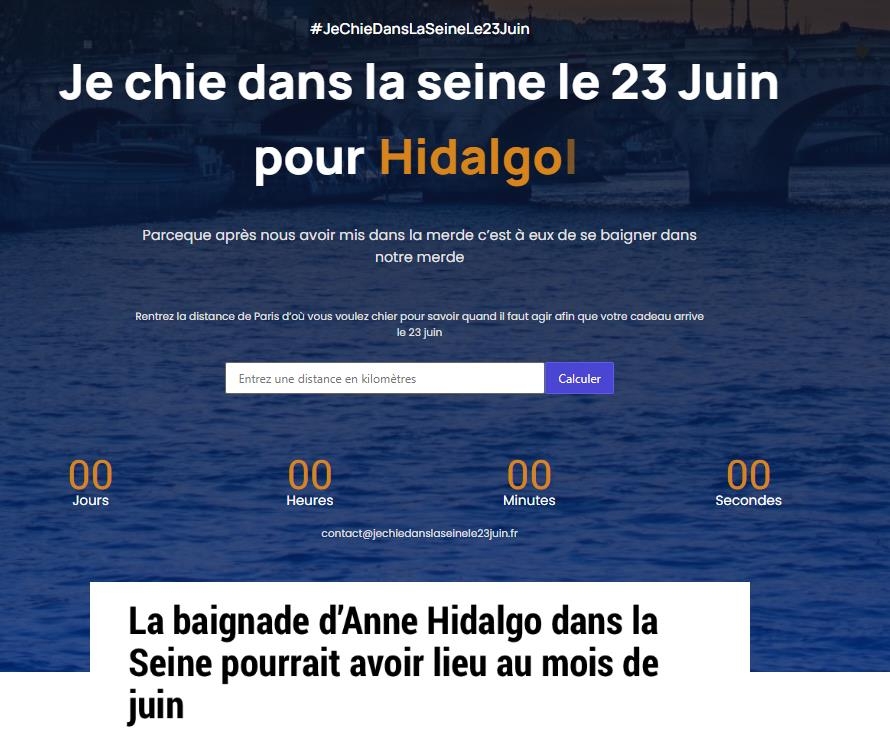 사이트는 센강이 깨끗하다는 점을 증명하기 위해 센강에서 직접 수영을 하겠다고 선언한 에마뉘엘 마크롱 프랑스 대통령과 안 이달고 파리 시장을 조롱하면서 "그들은 우리를 똥 속으로 빠뜨렸고, 이제 그들이 우리의 똥 속으로 빠질 차례"라고 주장했다.