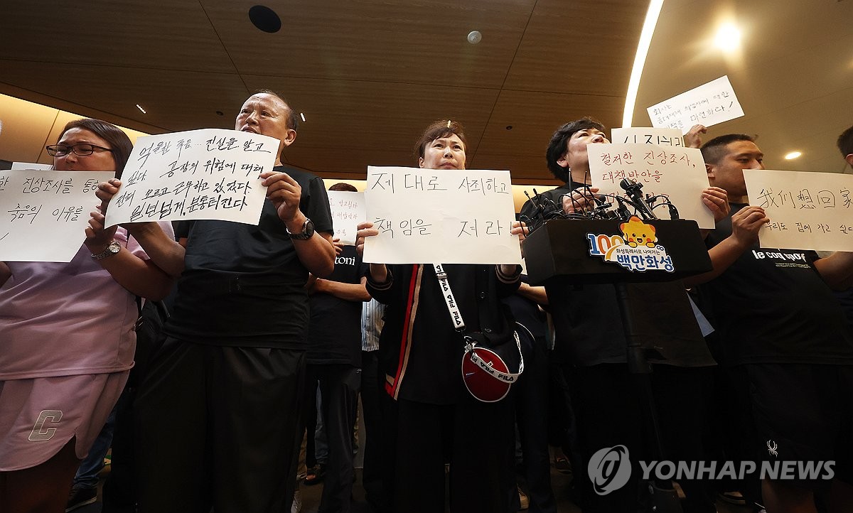 (화성=연합뉴스) 김솔 기자 = 경기 화성시 아리셀 화재 사고 유족들이 30일 사고에 대한 철저한 진상 규명과 책임자 처벌을 촉구했다.