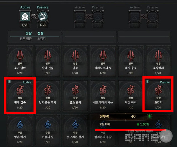 어빌리티-견습전사 안내 영상에서는 정찰-전투집중(액티브, 명중+)과 정찰-초감각(패시브, 모든 피해+1%)을 선택해서 태그를 완성시켰다. 그러자 전투력이 40 올라갔다.