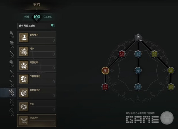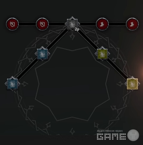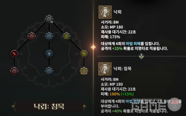 다음은 강화다. 강화-일격필살(액티브, 치명타 피해+10%)과 번개정령(패시브, 피해감소+1%)을 선택했다. 전투 태그에서는 난무(공속 증가), 무기연마(패시브, 공격력+10) 세트를 완성시켰다.