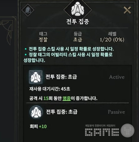 한 예로 정찰이라는 태그의 '전투 집중'이라는 어빌리티를 보면 전투 집중 스킬 사용시 일정 확률로 성장한다. 정찰 태그의 어빌리티 스킬 사용시 일정 확률로 성장하다고 되어 있다. 액티브 스킬인 경우 공격시 15회동안 명중이 증가하고, 패시브는 회피가 10 증가한다. '명중'이 들어갔다는 점에서 무소과금 이용자의 직업인 '활'에게는 반드시 필요한 어빌리티인 것으로 보인다.