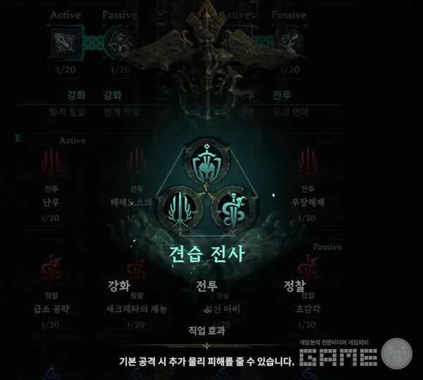 그러면서 강화, 전투, 정찰이라는 견습 전사 어빌리티가 완성됐다. 그러자 기본 공격시 100% 확률로 대상에게 150%의 추가 물리 피해를 입힌다는 내용이 나온다. 직업이 완성되면서 레벨이 올라감에 따라, 공속이나 공격력, 명중 등의 추가 포인트가 주어지게 되는 것이다.