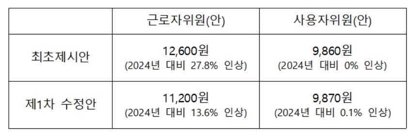 노동계는 올해보다 27.8% 대폭 오른 시간당 1만2천600원을 최초 요구안으로 제시했다가 1천400원을 낮췄고, 경영계는 '9천860원 동결' 요구에서 단 10원을 올려 수정안을 제시했다.