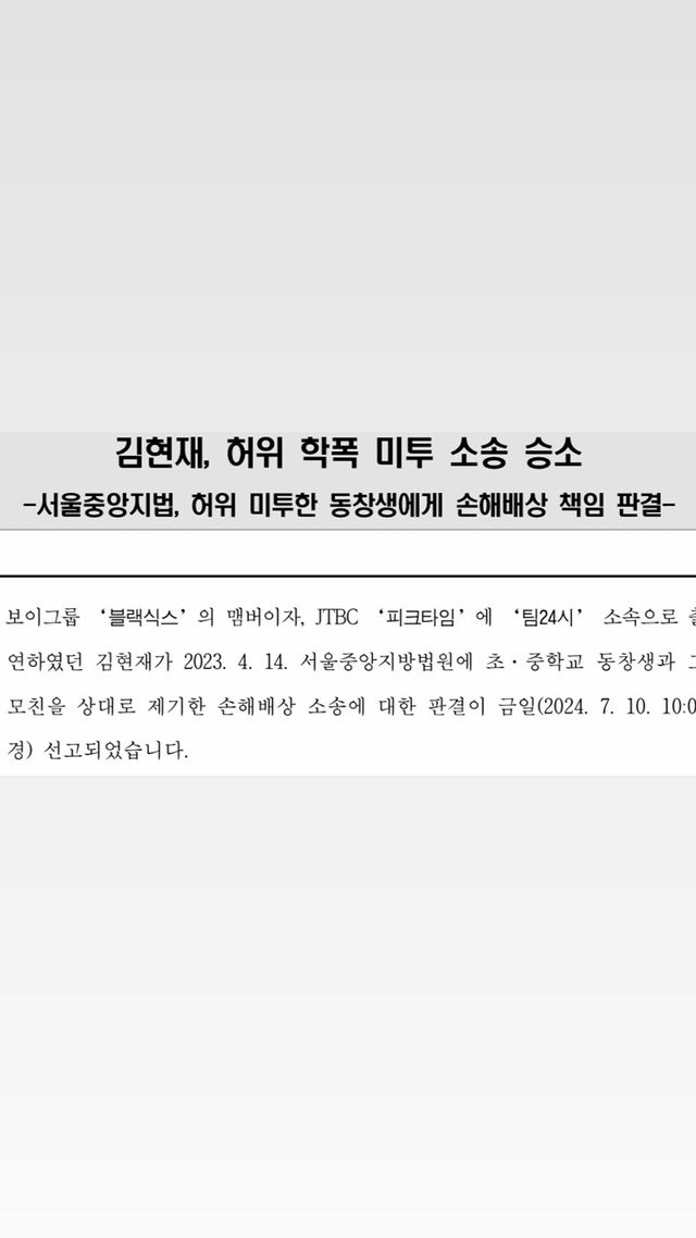 김현재는 10일 오후 '김현재, 허위 학폭 미투 소송 승소'라는 제목의 글이 담긴 사진을 게재했다.