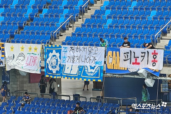 하지만 이날은 달랐다. 경기 전부터 홍 감독을 비판하는 걸개가 펼쳐졌다. 대표팀 감독 후보로 거론될 때부터 대한축구협회에 트럭시위를 진행하고, 화환을 보내며 홍 감독을 지켰던 팬들은 'LIAR', '피노키홍'이라고 적힌 걸개를 내걸었다. 얼마 전까지만 해도 "팬들은 걱정하지 않으셔도 된다"고 했던 홍 감독의 거짓말을 비판한 것이었다.