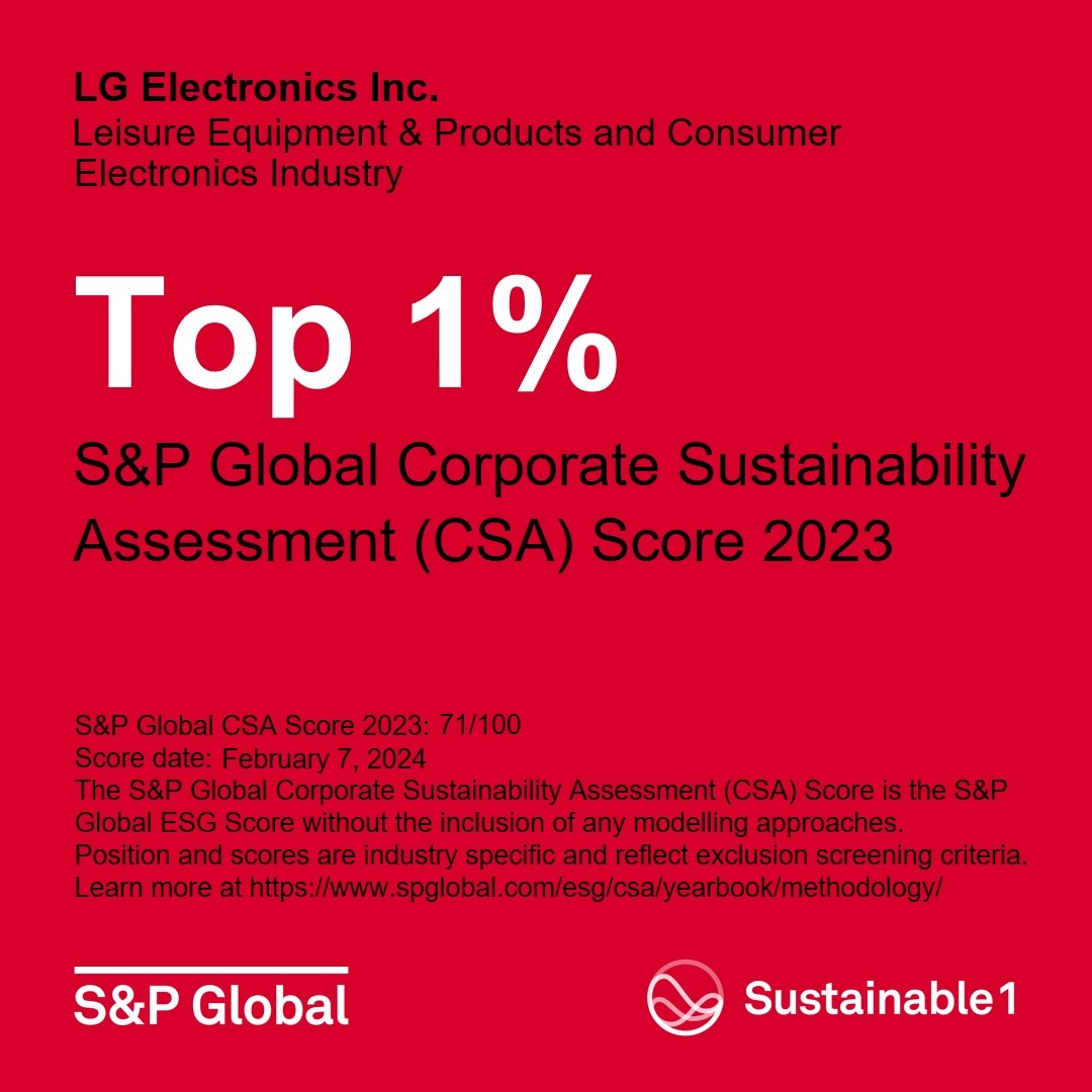 LG전자는 올해 세계적인 신용 평가 기관 스탠더드앤드푸어스(S&P) 글로벌의 '기업 지속가능성 평가'에서 최상위 등급인 '톱 1%'로 선정됐다.