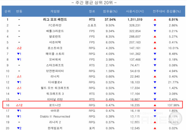 ◇ [PC게임] '로드나인' PC방 순위에서 '두각'
