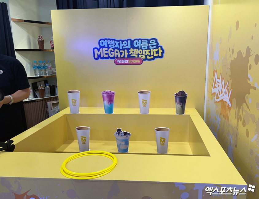 메뉴 주문 이후 2층에 올라선 유저는 총 3종의 미니 게임에 참여할 수 있다. '그래피티 드로잉 체험존' '바람을 뚫고~ 메가 링토스!' '두근두근 메가의 마음을 채워라' 등의 콘텐츠 수행을 통해 랜덤 포토카드 3종을 받을 수 있다. 아울러 오프라인 이벤트 매장에서만 만나볼 수 있는 콜라보 장패드도 선보인다.