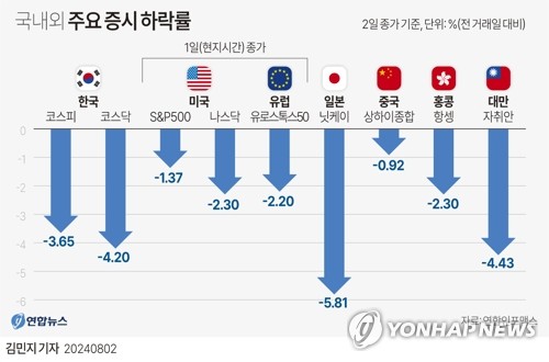 하락률은 2020년 8월 20일(3.66%) 이후 약 4년 만에, 지수 하락폭은 2020년 3월 19일(133.56포인트) 이후 4년 5개월여만에 가장 컸다.