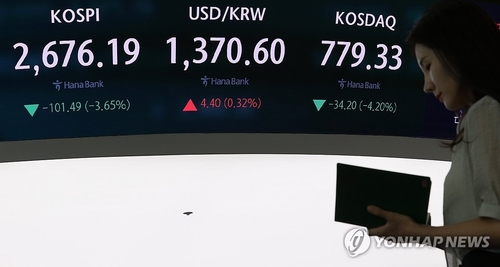 이날 코스피 종가는 전 거래일 대비 101.49포인트(3.65%) 내린 2,676.19로 집계됐다.