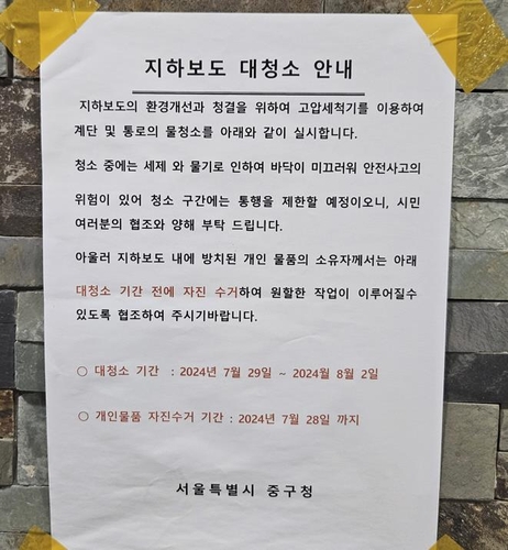 지하보도 벽에는 '7월 29일부터 8월 2일까지 계단 및 통로의 물청소를 실시한다'는 중구청 안내문이 붙어 있었다. 안내문에는 '지하보도에 방치된 개인 물품은 (청소 시작 전인) 7월 28일까지 자진 수거해 달라'는 내용도 포함돼 있었다.
