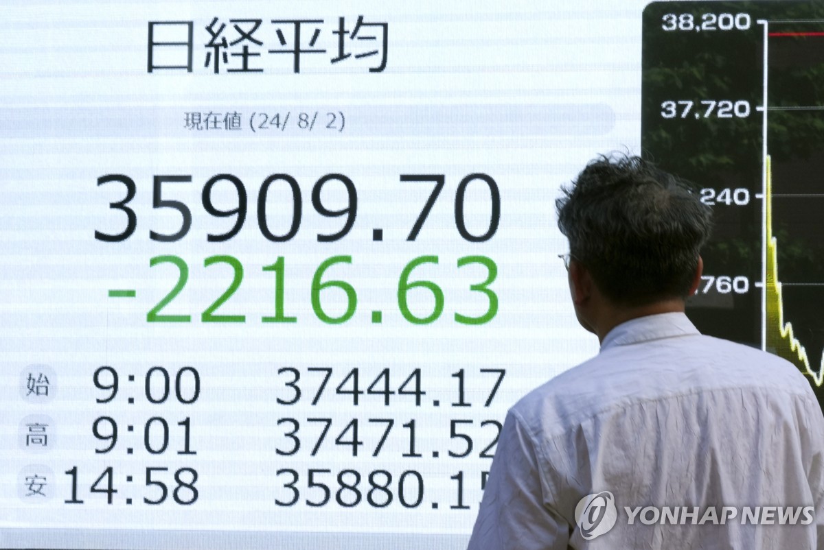 (도쿄=연합뉴스) 경수현 박상현 특파원 = 일본 증시 대표 주가지수인 닛케이225 평균주가(닛케이지수)가 5일 미국 경기 침체 우려에 4,451포인트 폭락하며 사상 최대 낙폭을 경신했다.