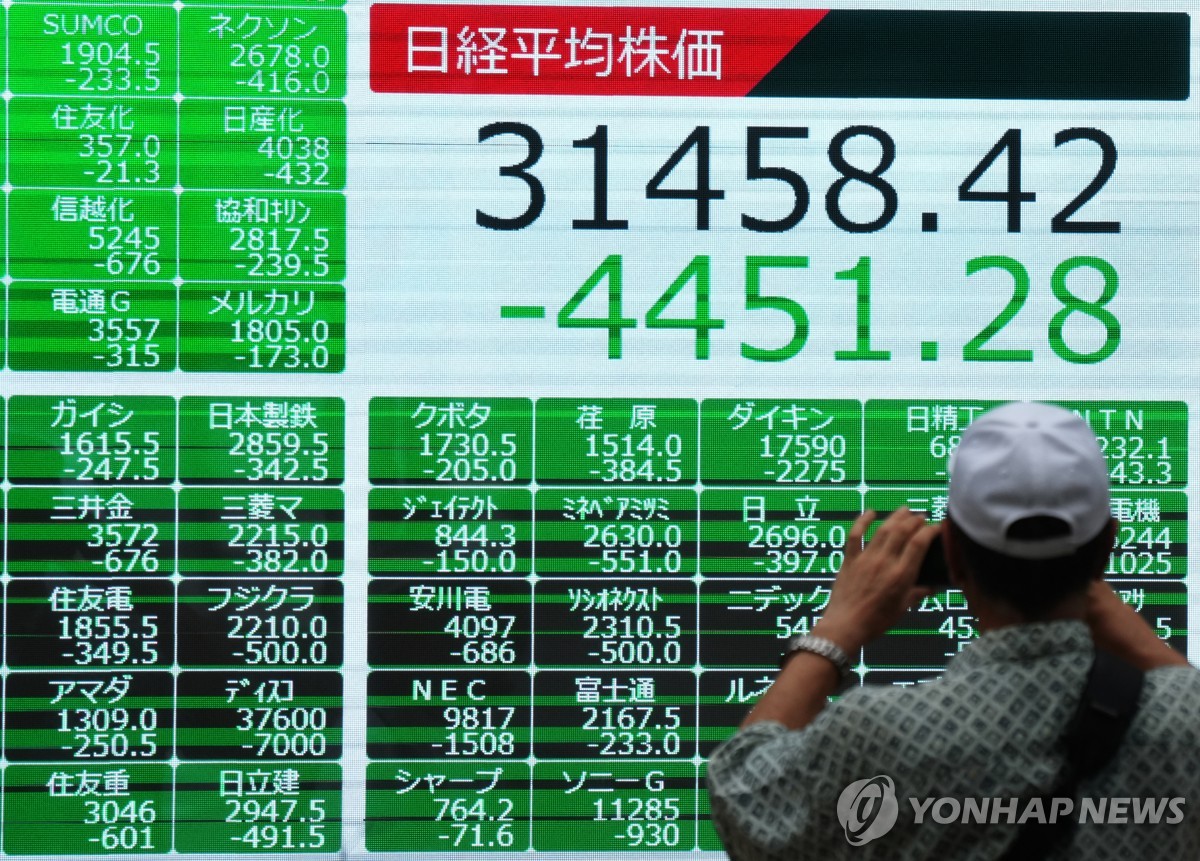 (도쿄=연합뉴스) 경수현 박상현 특파원 = 일본 증시 대표 주가지수인 닛케이225 평균주가(닛케이지수)가 5일 미국 경기 침체 우려 등으로 무려 4,451포인트 폭락하며 사상 최대 낙폭 기록을 경신했다.