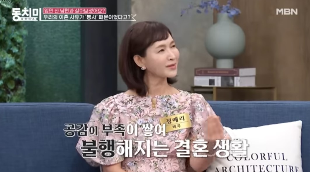 정애리는 "사실 저는 기사를 보지 못했었는데 전남편이 이혼 사유를 봉사 때문이었다고 인터뷰를 하셨더라. '나는 적극적으로 봉사를 하고 싶었는데 아내 정애리는 조용히 봉사하길 바랐기 때문에 맞지 않았다'고 인터뷰를 했더라. 그게 이혼 사유였다고 그분께서 말씀을 하셨다"고 전했다.