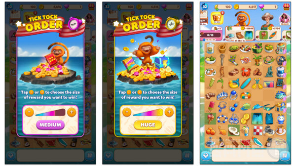 트래블 타운의 틱톡 주문(Tick Tock Order)은 '선택 보상' 이벤트의 가장 직접적인 예 중 하나다. 이 게임은 이벤트를 Merge-2 with orders 게임플레이의 핵심에 완벽하게 일치한다. 이벤트는 원숭이가 도착하여 주문을 하는 것으로 시작하는데, 이는 게임의 다른 모든 주문과 마찬가지로 작동하지만 플레이어는 투자하고자 하는 노력 수준을 선택할 수 있다.