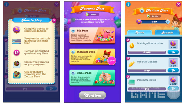 캔디 크러쉬 소다 사가는 보상 패스 이벤트를 통해 '선택 보상'과 패스 시스템을 독특하게 조합한다. 플레이어는 3일 동안 3가지 패스 옵션 중 하나를 완료해야 하며, 각 패스 옵션에는 다른 수의 마일스톤과 보상이 있다. 트래블 타운과 달리 플레이어는 그 과정에서 새로운 마일스톤에 도달하여 보상을 획득하므로 이벤트가 캐주얼 플레이어에게 훨씬 더 친숙하다.