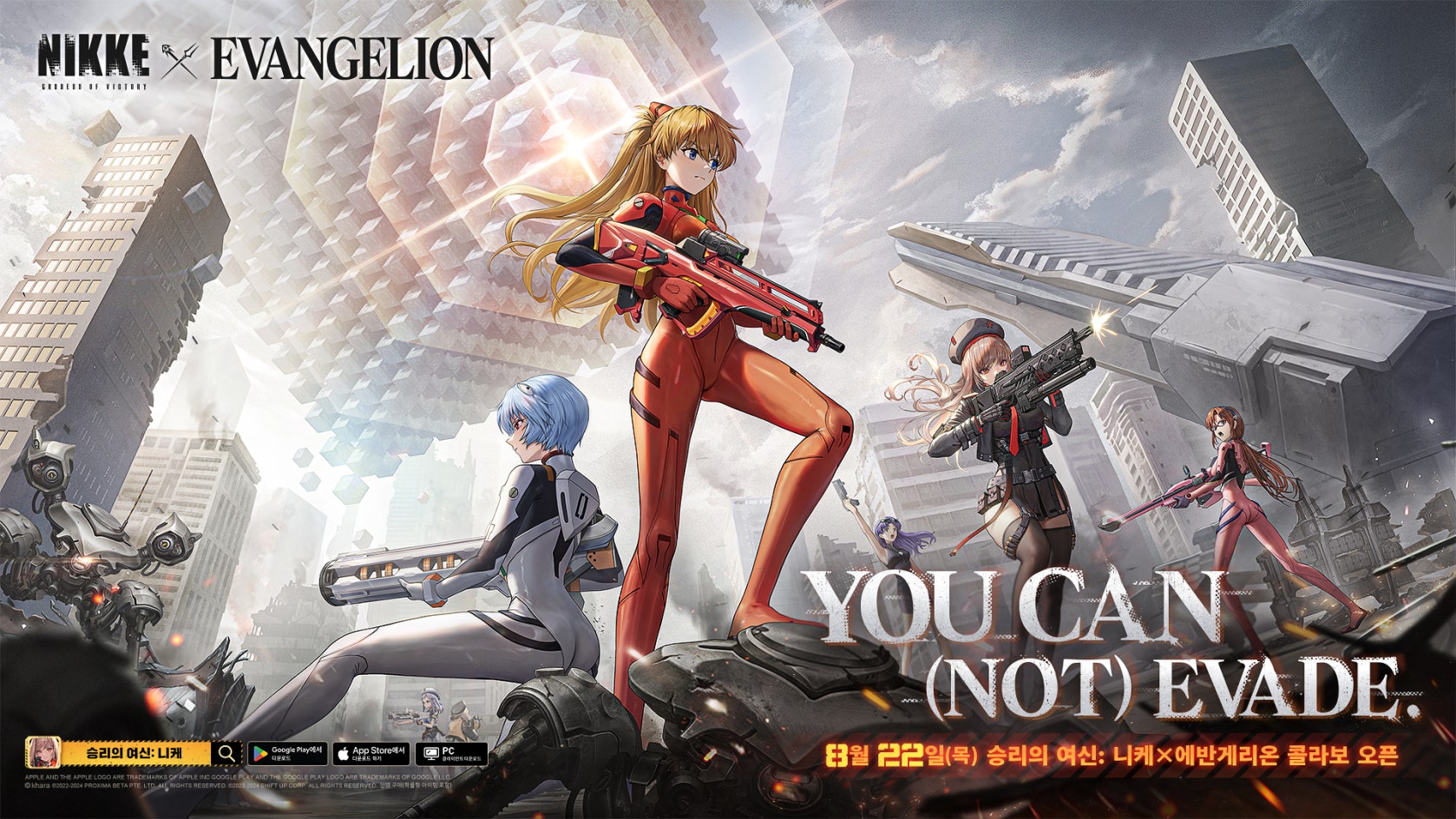 이번 콜라보 콘텐츠에서 '니케' 유저는 ‘에반게리온’ 인기 캐릭터 아스카, 레이, 마리, 미사토 총 4명을 만나볼 수 있다. 어느 때보다 풍성한 혜택이 마련된 기간 한정 이벤트 ‘YOU CAN (NOT) EVADE.’도 실시된다.