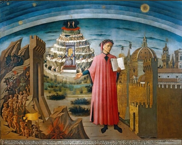 대부분 그림 속에 단테는 베르길리우스(BC 70~BC 19)와 함께 있다. 로마 제정 초기 로마 건국 서사시 '아이네이스'를 쓴 베르길리우스를 유별나게 존경한 단테는 그를 지옥과 연옥까지 인도하는 안내자로 삼았다.