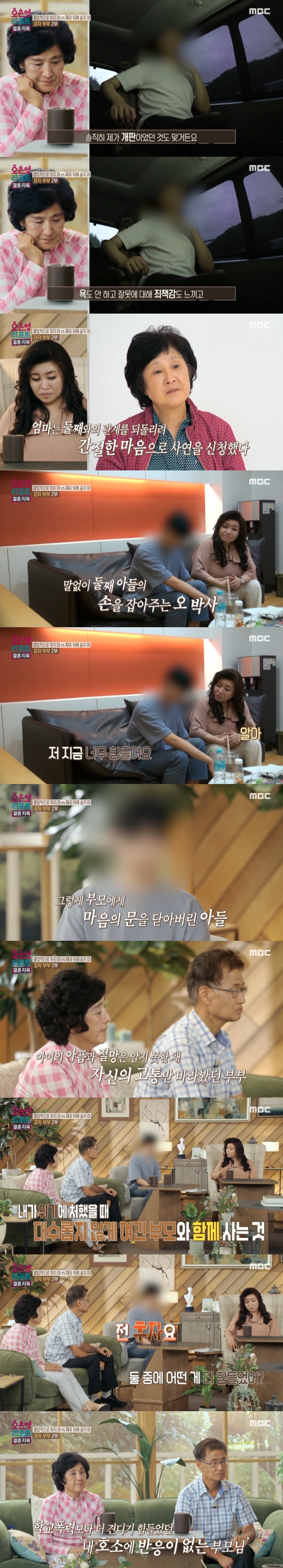 부부와 화해시키려는 목적보다 “네 인생이 중요하다”며 마음의 상처를 어루만졌다. 오은영 박사의 말을 듣고 용기를 낸 둘째 아들은 두 손을 꼭 잡고 녹화장에 입장했다. MC 문세윤은 환하게 웃으며 “패기 좋아!”라고 아들을 반겼다.