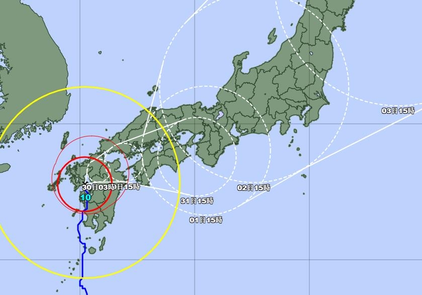 이번 태풍으로 인한 예상 강수량은 30일 낮까지 24시간 동안 규슈와 시코쿠 각 400㎜, 도카이(혼슈 중부) 300㎜, 긴키(혼슈 중서부) 200㎜ 등으로 예보됐다.
