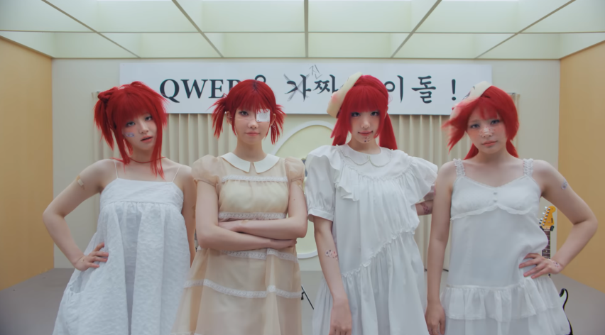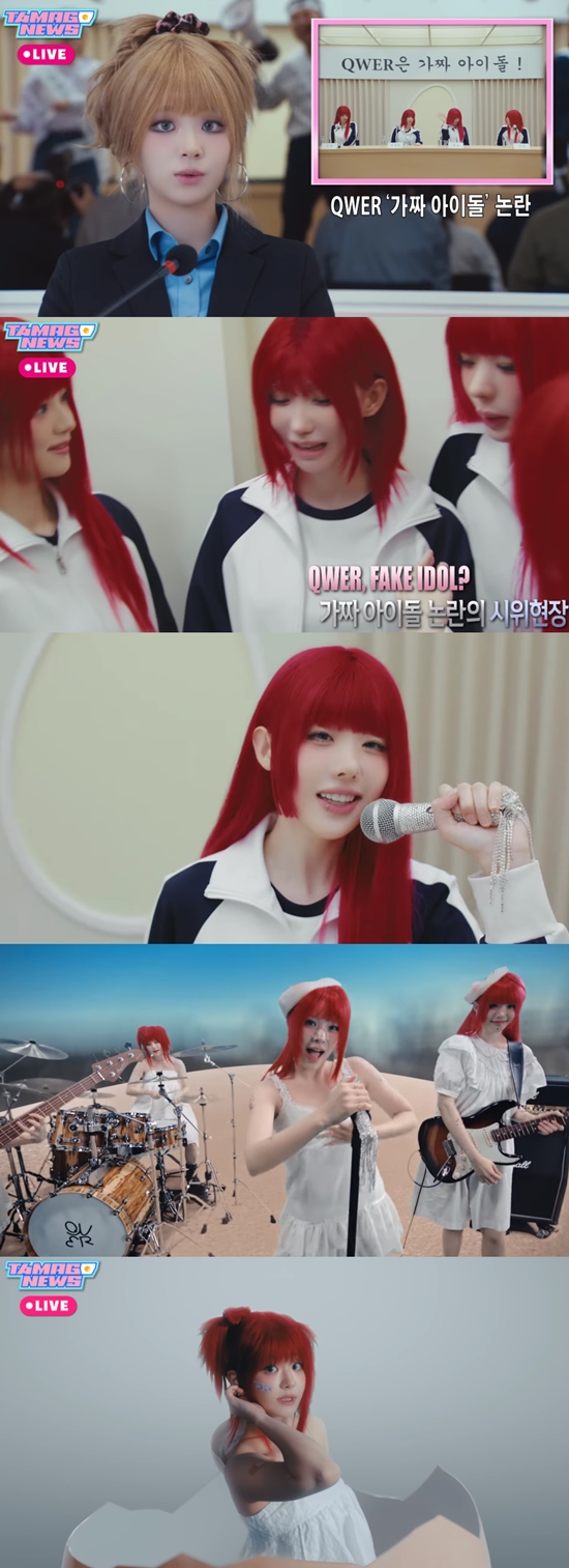 함께 공개된 뮤직비디오에는 기자회견장을 배경으로 '가짜 아이돌' 논란에 휩싸인 QWER의 모습이 유쾌하게 그려졌다. 멤버들은 자신들을 향해 "가짜 아이돌"이라고 외치는 이들에게 밴드 연주를 들려주며 정면승부로 맞선다.