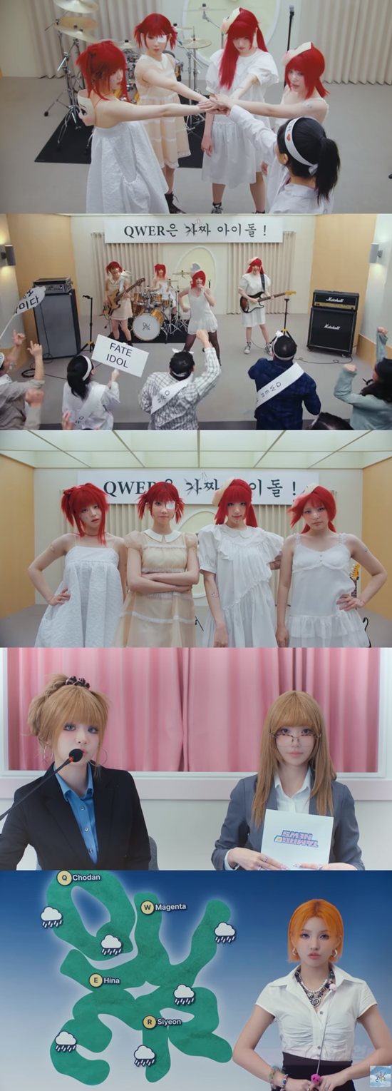 2일 오후 6시 QWER(쵸단, 마젠타, 히나, 시연)의 새 디지털 싱글 '가짜 아이돌'의 음원과 뮤직비디오가 공개됐다.