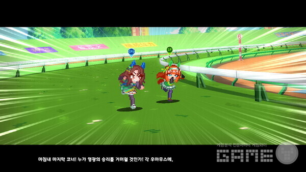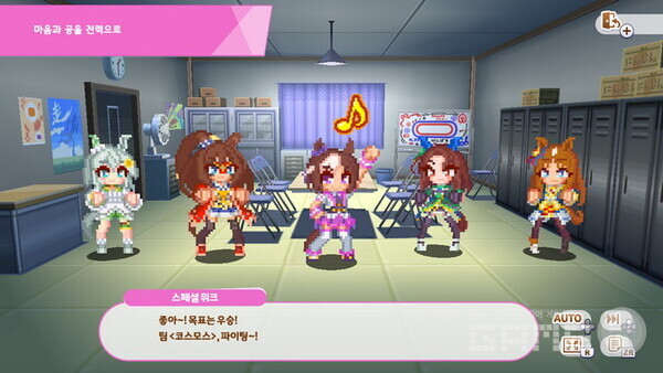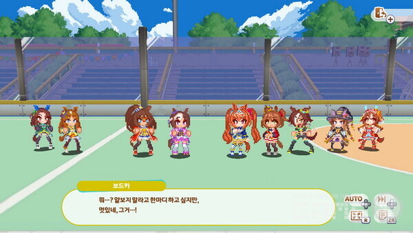 게임의 기본은 스토리 모드라고 할 수 있다. 스토리 모드를 선택하면 원하는 팀을 선택한 다음 스토리를 진행할 수 있다. 게임 그래픽은 잘 알려진 것처럼 도트 그래픽으로 개발됐다. 어떻게 보면 오래된 게임 같기도 하며 투박해 보이기도 하지만 각 ‘우마무스메’만의 특징을 잘 살렸다는 것을 알 수 있다. 특히 원작 ‘우마무스메’를 플레이해 봤다면 캐릭터별 특징에 대해 알 수 있을 것이다.