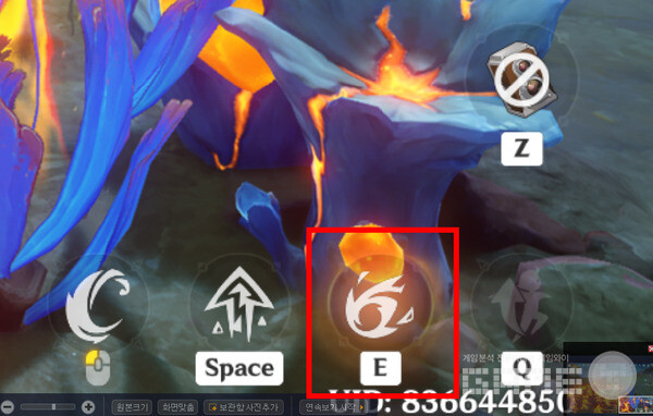 이제 [산왕이 잠든 동굴로 가기]다. [주변에 있는 심연의 힘을 제거하고 화로 점화하기(6)]다. 파란색과 주황색이 함께 있는 장치(아래 사진 참고)에 대고 E를 누른 다음, 우하단 E 아이콘이 붉게 빛나는 것을 확인하고, E를 길게 홀드하여 검은 오염에 타깃을 맞춘다음, 떼면 발사가 된다.