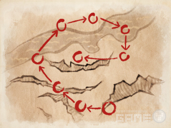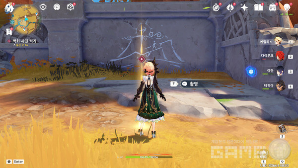 [나, 불 운반자] 시작이다. 다음날 [휴니, 토바와 대화하기]다. [계속해서 둘러보기]다. 춤을 추고 있던 [티아고가 알려준 벽화가 있는 곳으로 가기]다. 꾀나 먼 곳이다. 미리 이 지역 워프 포인트를 찍어두기 바란다. 신전을 점거하고 있는 마물이 보인다. [마물 격퇴하기]를 하자. 마물을 격퇴하면 벽화가 보인다. [벽화 사진 찍기]를 하자.