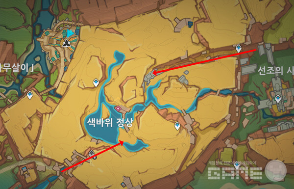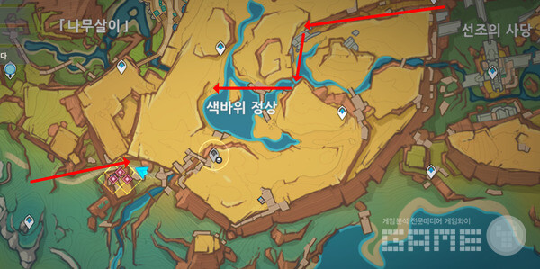 퀘스트 시작은 색바위 정상 근처다. 그런데 여기 퀘스트를 받기 위해서 올라가는 방법이 결코 쉽지 않다. 기자는 선조의 사당 근처에서 절벽 위로 올라온 다음, 여러 워프 포인트를 열었다.