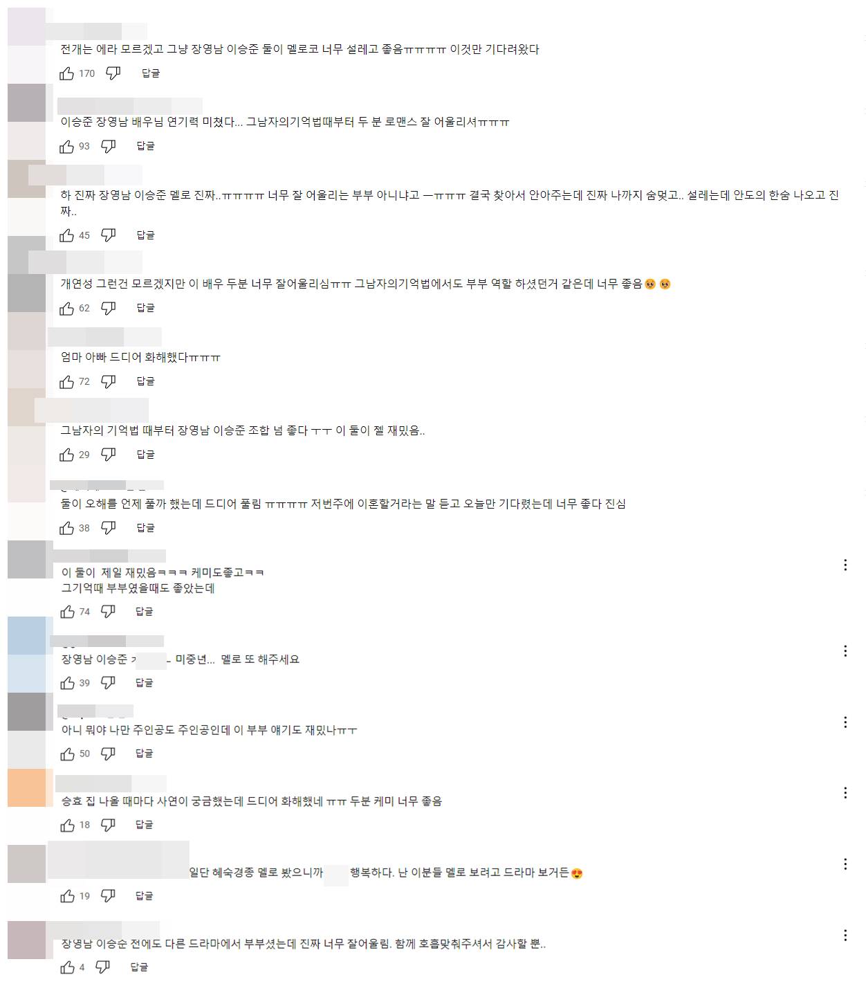 서혜숙, 최경종이 드디어 서로의 진심을 깨닫자 시청자들은 "전개는 모르겠고 그냥 장영남 이승준 둘이 멜로코 너무 설레고 좋음ㅠㅠㅠㅠ 이것만 기다려왔다", "이승준 장영남 배우님 연기력 미쳤다... 그 남자의 기억법 때부터 두 분 로맨스 잘 어울리셔ㅠㅠㅠ", "하 진짜 장영남 이승준 멜로 진짜..ㅠㅠㅠㅠ 너무 잘 어울리는 부부 아니냐고 결국 찾아서 안아주는데 진짜 나까지 숨멎고.. 설레는데 안도의 한숨 나오고 진짜", "개연성 그런건 모르겠지만 이 배우 두분 너무 잘어울리심ㅠㅠ 그 남자의 기억법에서도 부부 역할 하셨던 거 같은데 너무 좋음", "엄마 아빠 드디어 화해했다ㅠㅠㅠ", "둘이 오해를 언제 풀까 했는데 드디어 풀림 ㅠㅠㅠㅠ 저번주에 이혼할 거라는 말 듣고 오늘만 기다렸는데 너무 좋다 진심", "장영남 이승준 미중년... 멜로 또 해주세요", "아니 진짜 장영남 이승준 멜로코 너무 좋다니까요 ㅠㅠ" 등 뜨거운 반응을 보이고 있다.