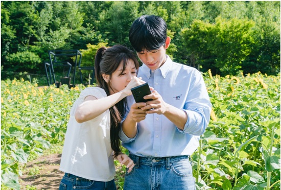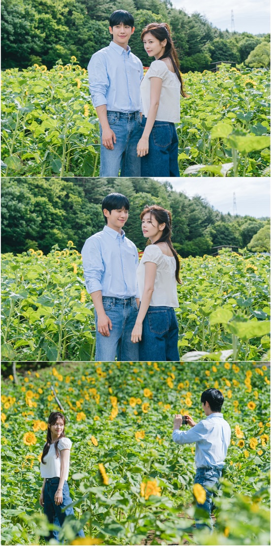 그런 가운데 25일 공개된 사진 속 최승효, 배석류가 달콤한 첫 입맞춤을 나눈 해바라기 꽃밭 사이 본체들의 대기 시간 모습이 이목을 집중시킨다. 마치 그림 같은 풍경을 배경으로 다정한 인증샷을 남기는 두 배우의 청량하고 달달한 비주얼 케미스트리가 감탄을 자아낸다.
