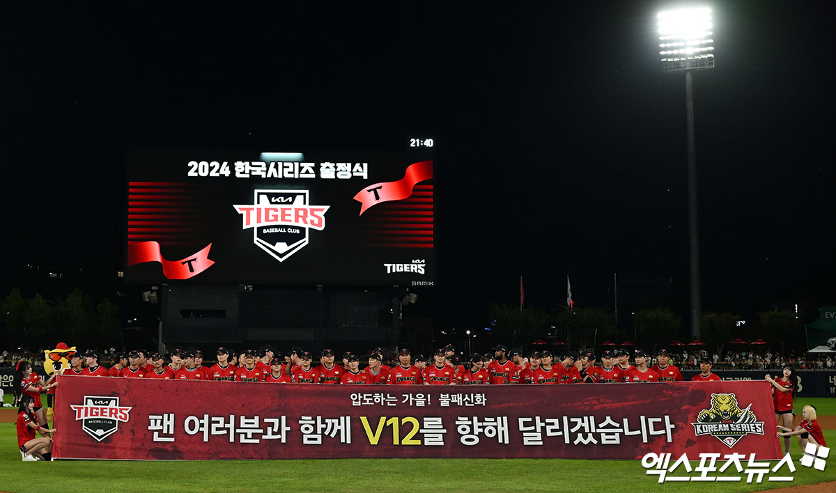 스포츠>한국 야구KIA '한국시리즈 출정식'[포토]엑스포츠뉴스입력 0 25일 오후 광주기아챔피언스필드에서 열린 '2024 신한 SOL Bank KBO리그' 롯데 자이언츠와 KIA 타이거즈의 경기, 경기종료 후 홈 최종전 감사 인사 및 한국시리즈 출정식이 진행됐다. 출정식에 참석한 KIA 선수단이 기념촬영을 갖고 있다.
