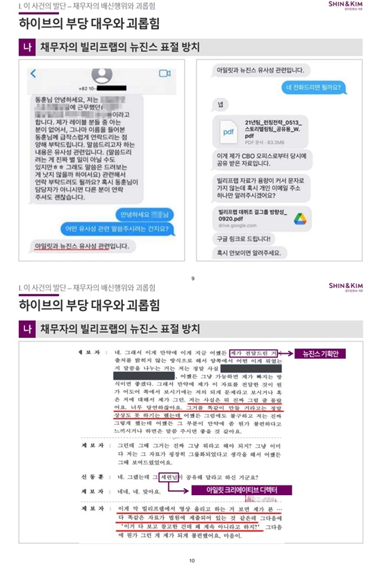 그러면서 "명백한 사실이 있음에도 빌리프랩은 표절의혹이 사실이 아니라고 지속적으로 부인하고 하이브는 이를 방치했다. 민희진 전 대표는 지난 4월 3일 '아일릿의 뉴진스 카피'에 대해 내부적으로 문제제기를 하였는데, 이러한 문제 제기가 정당하였음이 객관적 증거에 의해 명확히 드러난 것"이라며 "이로써 하이브의 감사는 정당성이 전혀 없는 불법감사임이 다시 한번 확인되었다"고 설명했다.