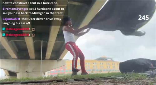 그는 고가도로 밑에서 텐트를 치면서 "사람들을 즐겁게 하기 위해" 허리케인 속에서 살아남는 모습을 보여주겠다고 말했다.