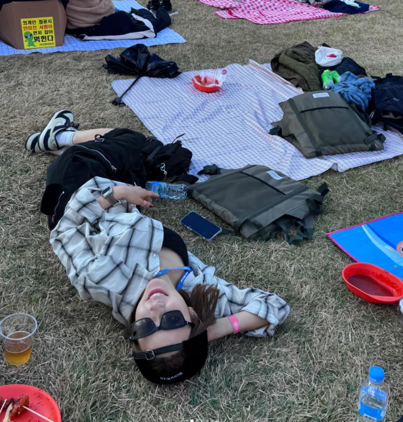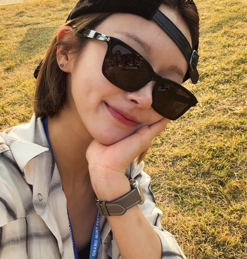 공개된 사진 속 초아는 '2024 그랜드 민트 페스이벌'에 관객의 한 사람으로 참석했다. 그는 헐렁한 체크 셔츠에 나시티를 입고 바닥에 누워 포즈를 취하고 있다.